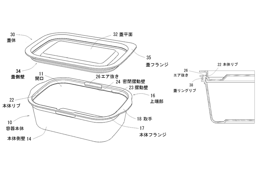 店頭では、ラベルに特許番号が載っていたので、実際の明細書でどんなことが特許として書かれているのか確認してみたくなり、検索して見てみることにしました。すると、自分の感じたこととは全く違う点が特許として記載されており、自分の感覚とのギャップに大いに驚いたのです。請求項に載っていた構成は、容器本体の内壁にぐるりとリブを設けること、また、容器本体にはまり込む蓋の外壁にもぐるりとリブを設けること、そして、容器本体の内壁の一部を外側に凹ませて外気に通じるようにすること、などでした。